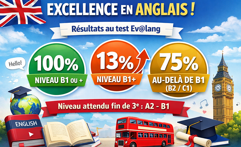 À l’issue du test national Ev@lang, conçu pour positionner les élèves sur l’échelle du CECRL, nos élèves de 3ème atteignent des résultats remarquables :